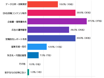 - 一方、「広告の運用管理」(26.0%)や「データ分析・効果測定」(19.0%)では、