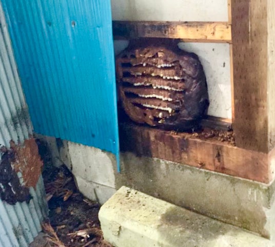 「宅配業者の方がスズメバチの巣があると教えてくれて、玄関フード上にバレーボールくらいの立派な巣を発見!」