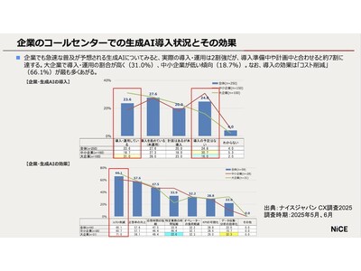 企業のコールセンター業務で生成AIをすでに導入・運用している企業は全体で23.6%で、昨年17%より6.6%増加しました。大企業においてはその傾向はより顕著で、昨年21%から31%と10%の増加となりました。生成AIの導入効果は「コスト削減」が最も高く(66.1%)、続いて「正答率の向上」(57.6%)となっています。