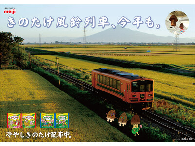 株式会社 明治(代表取締役社長:松田 克也)は、冷やしても美味しいロングセラーブランド「きのこの山」「たけのこの里」と、涼しげな音色の「風鈴列車」で有名な津軽鉄道株式会社(代表取締役社長:澤田 長二郎)とコラボレーションし、2023年8月16日(水)から8月31日(木)の期間限定で津軽鉄道・走れメロス号を『きのたけ風鈴列車』として運行いたします。
