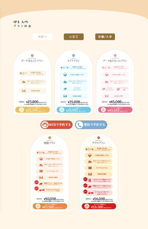 データの即日お渡しが可能な"データまるごとプラン"から、豪華なアルバムやオプション商品がつく"福袋プラン"など、お客様のご希望に合わせた撮影プランをご用意。