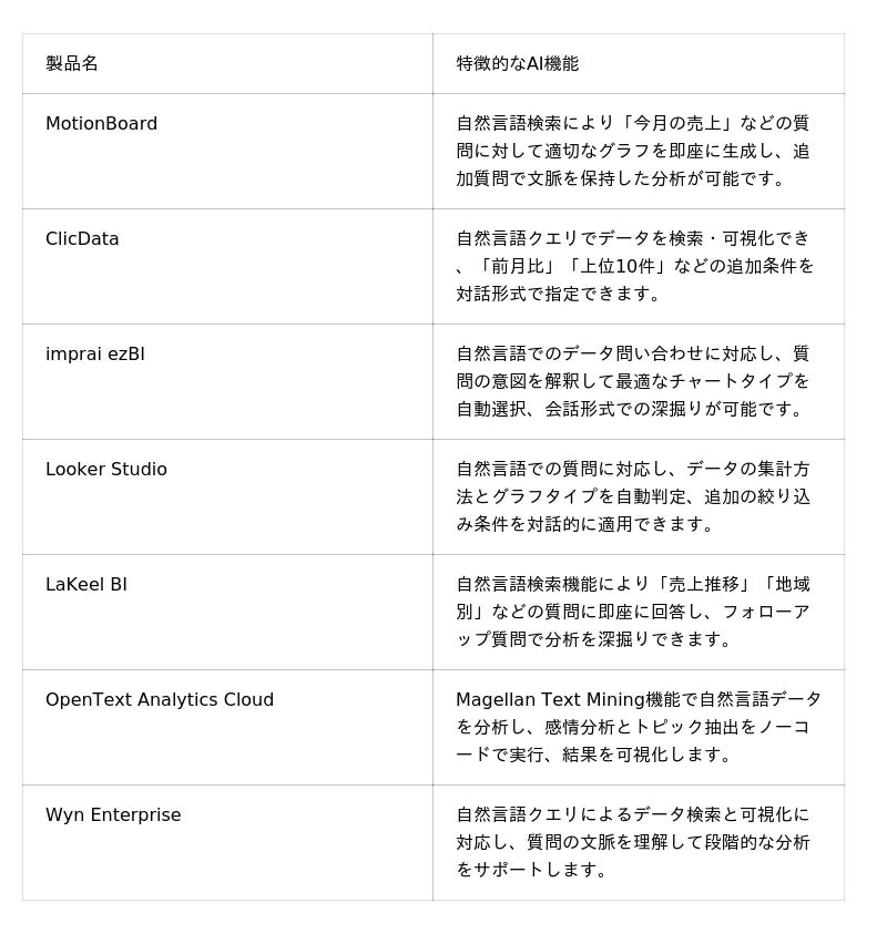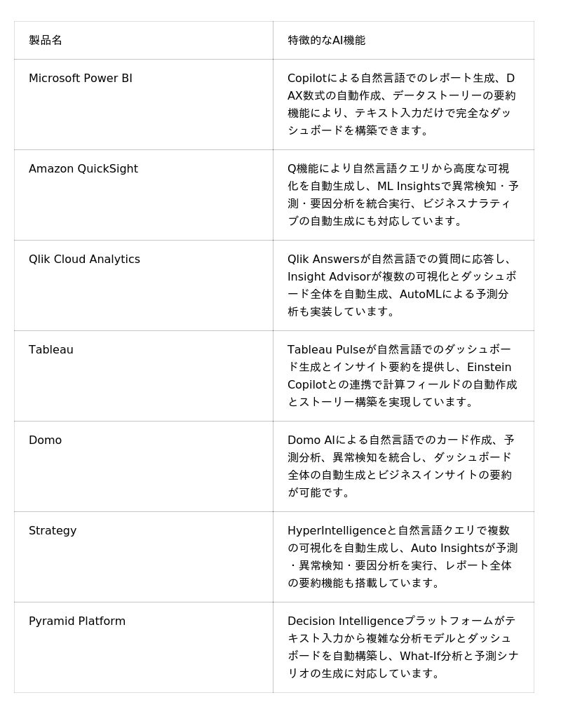 日本のBI市場では、海外製品を中心にL2~L3レベルのAIが分析して説明する機能や、AIと会話して分析できる機能が実装され始めています。特に、日本語での自然な問いかけに対応できる製品が増え、非エンジニアでもデータ分析にアクセスしやすい環境が整いつつあります。一方で、「分析もレポートも全自動」(L4)レベルに到達している製品はまだ限られており、日本語でのダッシュボード自動生成や計算式の自然言語生成は、Power BIやTableauなどグローバル大手が先行している状況です。国内製品においても、「異常を検知して通知」(L1)機能の実装は進んでおり、「見逃していた重要な変化」を自動で通知する基本機能は多くの製品で利用可能になっています。