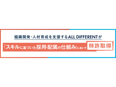 累計20,000社450万人以上の組織開発・人材育成を支援するALL DIFFERENT(オールディファレント)株式会社(所在地:東京都千代田区 代表取締役社長:眞崎大輔)は、「スキルに基づいた採用・配属の仕組み」において特許を取得したことをお知らせします。