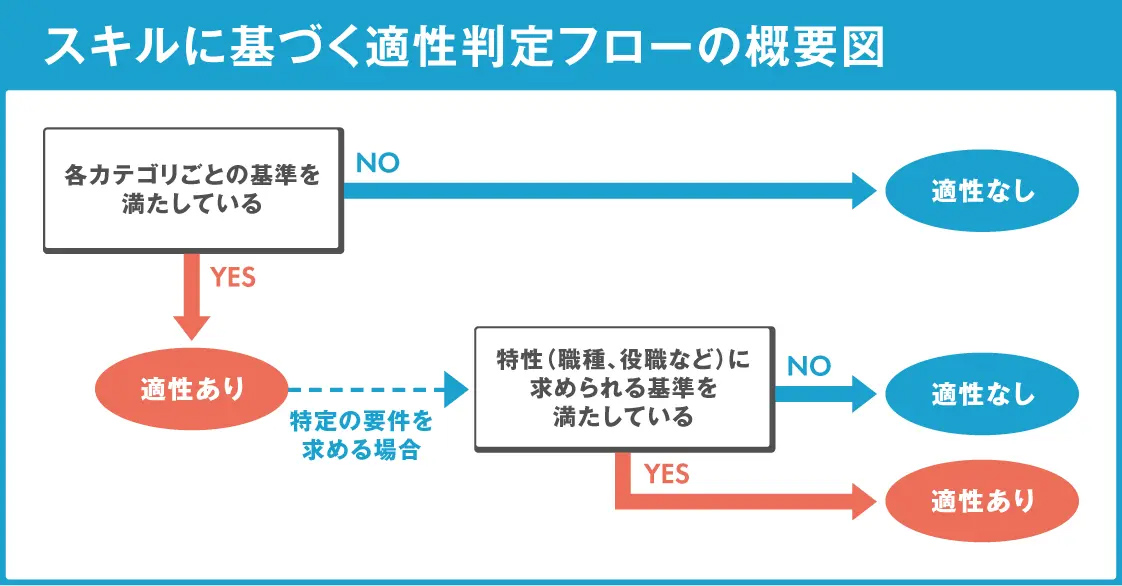 対象者が、採用や配属に必要な「バイタルスキル(R)」(成長、成果に不可欠なビジネスにおける根幹スキル)等を持っているか判定し、スキルの総合評価値や各カテゴリのバランスなどから、採用・配属の判断材料としてご活用いただけます。