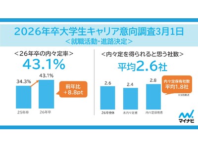 株式会社マイナビ(本社:東京都千代田区、代表取締役 社長執行役員:土屋芳明)は、2026年卒業予定の全国の大学生・大学院生を対象に実施した、「マイナビ 2026年卒 大学生キャリア意向調査3月1日<就職活動・進路決定>」の結果を発表しました。