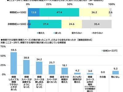 ここ2~3年で、喫煙できる場所の数が減ったと感じている喫煙者(237名)に、喫煙できる場所の数が減ったことで、どのような変化があったか聞いたところ、「喫煙したくても喫煙できないときがあった」(59.5%)が突出して高くなった。喫煙スペースの減少によって半数以上が喫煙をあきらめた経験があるようだ。以降、「喫煙スペースが混雑するようになった」(38.8%)、「喫煙スペースを探し回るようになった」(34.2%)、「喫煙スペースが遠くなった」(25.7%)が続いた。