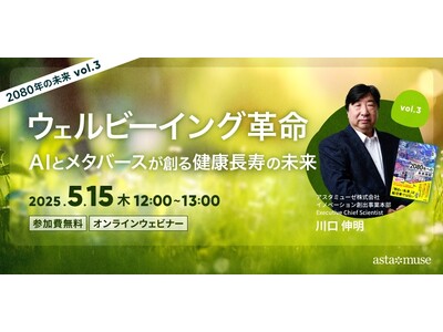 アスタミューゼ株式会社(本社:東京都千代田区、代表取締役社長 永井歩)は、2025年5月15日(木)12:00-13:00に、『2060 未来創造の白地図』および『2080年への未来地図』著者、弊社のExecutive Chief Scientistである川口伸明による無料ウェビナー「ウェルビーイング革命:AIとメタバースが創る健康長寿の未来~2080年の未来シリーズvol.3~」を開催いたします。書籍に取り上げた技術領域や社会課題、未来世界について語るウェビナーです。2024年9月に開催して以来、8か月ぶりの再開催となります。