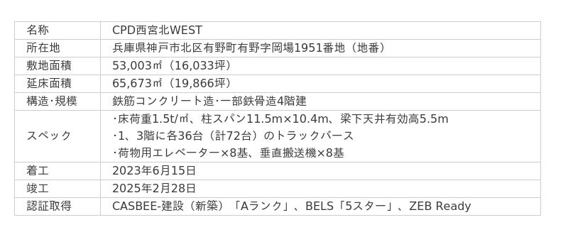 なお当社は、本特定目的会社を通じ、本物件に隣接するマルチテナント型物流施設「CPD西宮北EAST」(地上6階建、延床面積239,629平方メートル )の開発を進めており、2025年7月末の竣工を予定しています。