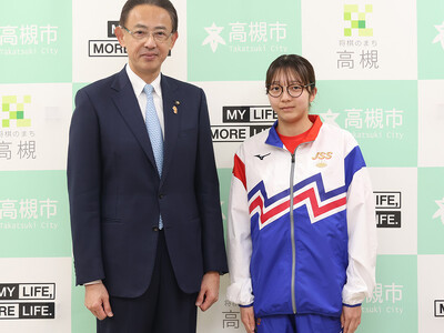 令和7年3月17日(月曜日)、高槻市立第十中学校3年生の山崎瑠花さんが市役所を訪問し、3月20日(木曜日)から23日(日曜日)まで東京都で開催される「第100回日本選手権水泳競技大会」の200メートル自由形(女子)に出場することを濱田剛史市長に報告しました。