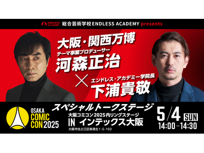 総合芸術学校エンドレスアカデミーが、2025年5月4日『大阪コミコン』内にて“大阪・関西万博テーマ事業プロデューサー”河森正治氏と“エンドレス・アカデミー学院長”下浦貴敬によるトークステージを開催する