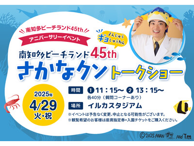 南知多ビーチランド&南知多おもちゃ王国(知多郡美浜町奥田428-1 所長:齊藤 敬一郎)では、南知多ビーチランドが開園45周年を迎える記念日である2025年4月29日(火・祝)に、特別イベントとして、お魚の豊富な知識と経験に裏付けされたトークで人気の“さかなクン“をゲストに迎え、生きものの魅力を伝えるトークショーを開催します。