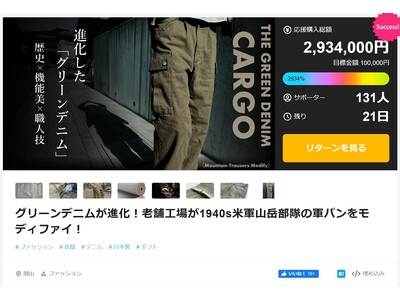 カーゴパンツ縫製に50年以上の歴史を持つ多賀株式会社(岡山県井原市、代表:多賀信祥)は、クラウドファンディングサイト「Makuake」で実施中の「グリーンデニムが進化!老舗工場が1940s米軍山岳部隊の軍パンをモディファイ!」プロジェクトが、目標金額の2934%を達成、多くのサポーターから支持を頂いたことをお知らせいたします。