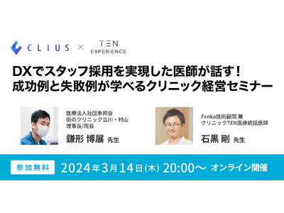 株式会社TEN EXPERIENCE(本社:東京都渋谷区、代表取締役社長:大江 航、以下当社)は、Fankaの導入を検討しているクリニック経営者の方や個人開業医の方に向け、電子カルテCLIUS(クリアス)を提供する株式会社DONUTSとの共同セミナーを2024年3月14日(木)にオンラインにて開催いたします。