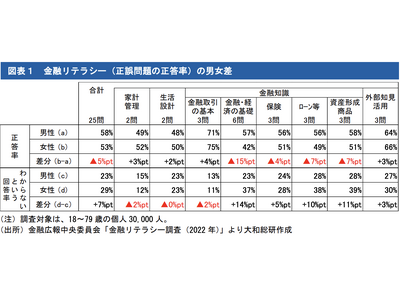 大和総研が2023年12月に発表したレポート「金融リテラシー教育の推進に向けて」によると、金融リテラシーの正答率は男性58%、女性53%と、女性の方が5ポイント低い結果となっています。ただし、「金融取引の基本」や「家計管理」では女性の方が正答率が高い一方で、「金融・経済の基礎」「資産形成商品」「ローン等」では相対的に低く、特に「預金金利」「複利計算」「インフレ」などの知識に差が見られました。