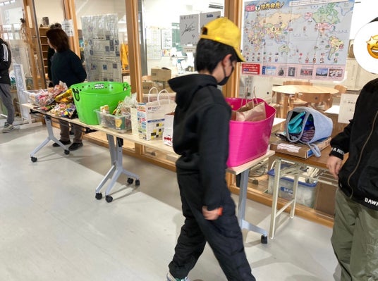 PTA役員が声掛けをする中で食品を持ってきてくれた児童たちの様子