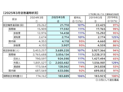 ●国際線旅客数は305万人(19年同月比95%)で、3月としては2019年に次いで2番目に高い水準とな