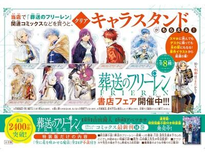今回のノベルティフェアは『葬送のフリーレン』に関連する対象コミックス・書籍を1冊購入すると、「クリアキャラスタンド」 (全8種) が1枚もらえます。
