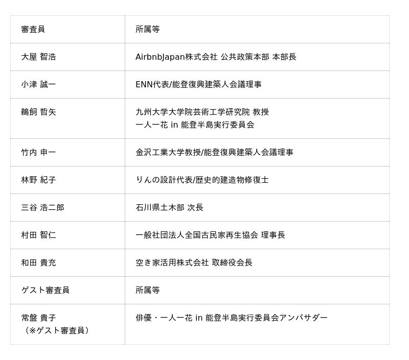 「能登空き家古民家リノベーションコンテスト」は、復興と地域再生の取り組みとして活動する「一人一花 in 能登半島プロジェクト」を応援しています。同プロジェクトの代表である九州大学大学院芸術工学研究院 教授・鵜飼哲矢氏に加え、同プロジェクトのアンバサダーを務める俳優・常盤貴子氏が、本コンテストに審査員として参画することが決定しました。
