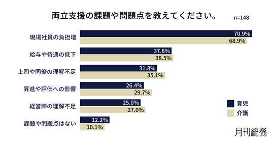 両立支援に関する課題について尋ねたところ、「現場社員の負担増」が育児70.9%、介護68.9%で最多となり、「給与や待遇の低下」「上司や同僚の理解不足」が続きました(n=148)。