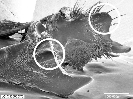 写真3 走査型電子顕微鏡(SEM)によって観察されたカブトムシ雌雄型個体の左右大あご(奥が左、手前が右)。白丸囲み部分は大あご上面の突起。