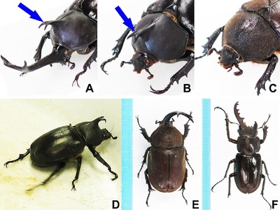 ・概形では、この個体の頭部には大きなツノがなく、正常なメスと同様の形態をしておりますが、胸部には正常なオスにあるような短いツノ(写真1A青矢印部分)があり、腹部にもオス交尾器が内蔵され、正常なオスと同じ特徴を有しています。