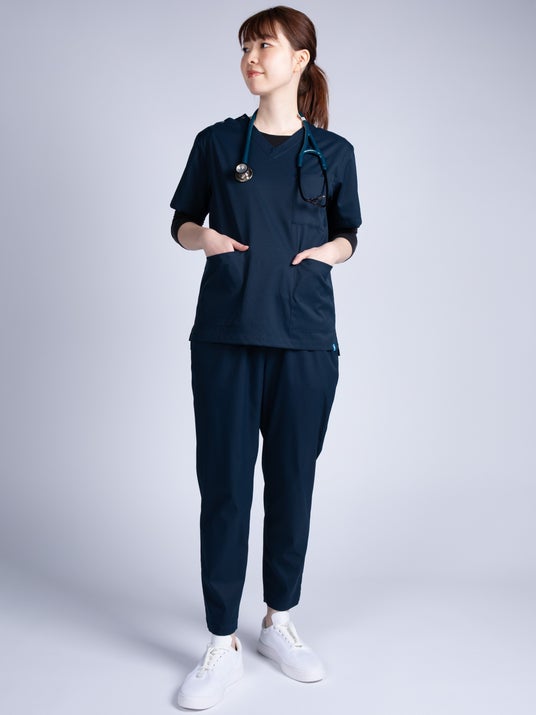 特徴:「スクラブシャツ」は胸ポケットとフロントポケットが計3つあり、胸ポケット内にペンを固定できるペン差しが2つ、左のフロントポケット内に医療用PHS(ピッチ)やスマートフォンが入る専用ポケットを完備。患者様と接触する際に静電気が起こりにくいように両脇下、裾、袖口、首後ろの計7か所に放電テープを配置。容易に着脱できるよう、右肩口をドットボタン仕様にしました。「スクラブパンツ」はウエストを総ゴムにし、股上を深めにすることで動きやすいデザインに。ポケットはサイドポケットとバックポケット以外に、ファスナー付きポケットの計5つ。スクラブシャツ同様、腰と裾の4か所に放電テープを配置しました。