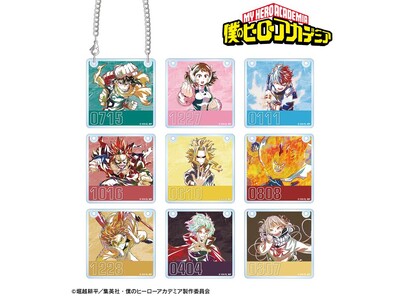 緑谷出久、爆豪勝己、飯田天哉、上鳴電気、耳郎響香、ミルコ、荼毘、レディ・ナガンのビジュアルを新たなタッチで魅力的に表現し、アクリルのドアプレート風チャームに仕上げました。20cmのチェーンが付属しております。