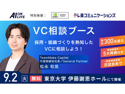 「初めてのチーム作り」を支援するベンチャーキャピタル、TeamMake Capital 創業者・松永和晃氏による「VC相談ブース」を特設することが決定いたしました。