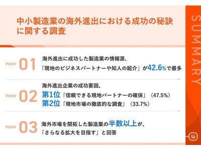 株式会社STANDAGE(本社:東京都港区、代表取締役 CEO:足立彰紀)は、海外進出して一定の成果を上げている(直近3年間の海外売上高が増加している)中小製造業(従業員数1,000名未満)の経営者・役員101名を対象に、中小製造業の海外進出における成功の秘訣に関する調査を実施しましたので、お知らせいたします。