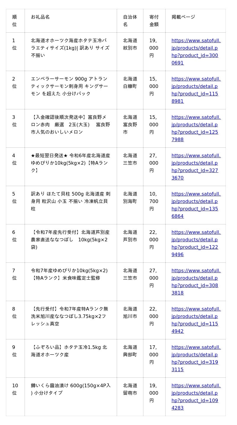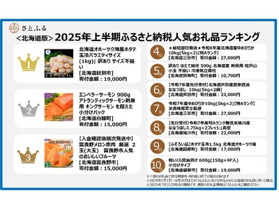 さとふる」を運営する株式会社さとふる(本社:東京都中央区、代表取締役社長 兼 CEO:藤井 宏明)は、「さとふる」の2025年上半期における<北海道版>ふるさと納税人気お礼品ランキング、および<北海道版>「体験・お出かけ」人気お礼品ランキングを発表します。