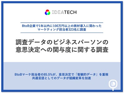 ワンストップでリサーチマーケティングを実現する「リサピー(R)?」(https://ideatech.jp/service/research-pr)を運営する株式会社IDEATECH(本社:東京都港区、代表取締役社長:石川友夫、以下:IDEATECH)は、BtoB企業(主力事業領域「BtoB」「BtoBtoC」「BtoBとBtoCの両方を展開している」)で1年以内に100万円以上の商材導入に関わったマーケティング担当者323名を対象に、調査データのビジネスパーソンの意思決定への関与度に関する調査を実施しましたので、お知らせいたします。