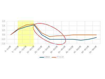 「氷撃α」の試験時の初期体温が高かったため、体温経過自体は高く表示されているが、運動終了直後にその差異がなくなるところまで体温は低下している。また運動中の体温上昇もプラセボと比較し抑えられており、また初期体温より低い状態が60分に渡り維持されている。