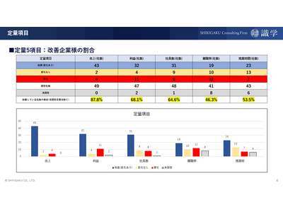 組織が長期的に継続して成長するための指標である定量項目(売上、利益、社員数、離職率、残業時間)がどうなったのかを見てみると、「改善した」と回答した企業は、売上については49社中43社(有効回答の87.8%)、利益については47社中32社(有効回答の68.1%)、社員数については48社中31社(有効回答の64.6%)、離職率は41社中19社(有効回答の46.3%)、残業時間は43社中23社(有効回答の53.5%)となり、全ての項目において改善した企業が多くありました。