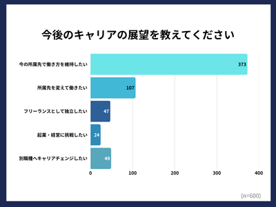 今後のキャリア展望については「今の働き方を維持したい」が62.2%(373人)で最も多く、安定志向の傾向が強く表れた。「ITエンジニアとして転職したい」は17.8%(107人、「ITエンジニアフリーランスとして独立したい」は7.8%(47人)となった。また、エンジニア以外の職種にキャリアチェンジしたいと答えた人は8.1%(49人)存在した。