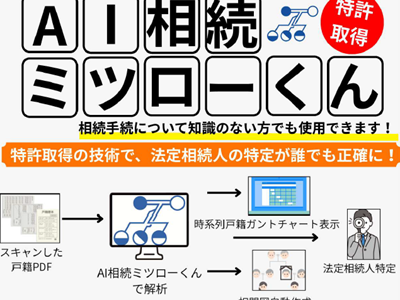 株式会社エスクロー・エージェント・ジャパン(本社:東京都千代田区、代表取締役社長:成宮正一郎)の完全子会社である株式会社サムポローニア(本社:東京都千代田区、代表取締役社長:竹内澄成、以下「サムポローニア」)が開発した相続関係説明図を瞬時に自動作成することができる「AI相続ミツローくん」の機能について、新たな特許を取得いたしましたのでお知らせします。