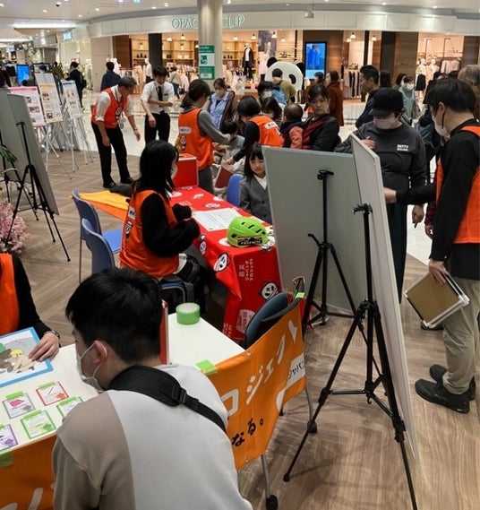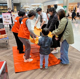 ワークショップでは、ハザードマップの見方をクイズ形式で学べる「ジャパンダくんと一緒に避難しよう」や、水害で非難する際に適した服装や持ち物を学ぶ「水害きせかえゲーム」、災害でケガをしてしまった時に身の回りにあるものを活用してできる応急手当を学ぶ「身の回りの物で応急手当」、災害で発生するさまざまなトラブルに対して解決方法を考える「防災カードゲーム なまずの学校」、地震や津波が起こったときに取るべき行動について体を使って覚える「防災紙芝居ちちんぷいぷい」等を行い、約270人の方にご参加いただきました。
