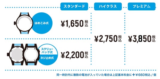 電池交換は、1,650円(税込)~。国産・高級国産・舶来品などのモデルや裏蓋の形状により料金は異なります。
