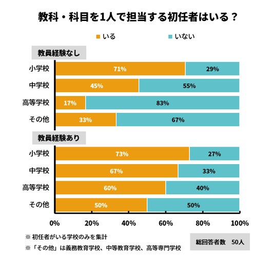 教員経験の有無にかかわらず、多くの初任者が指導教科・科目を1人で担当しています。