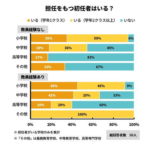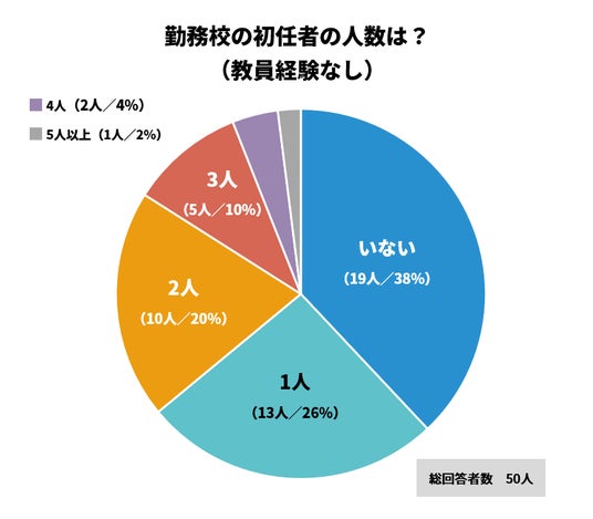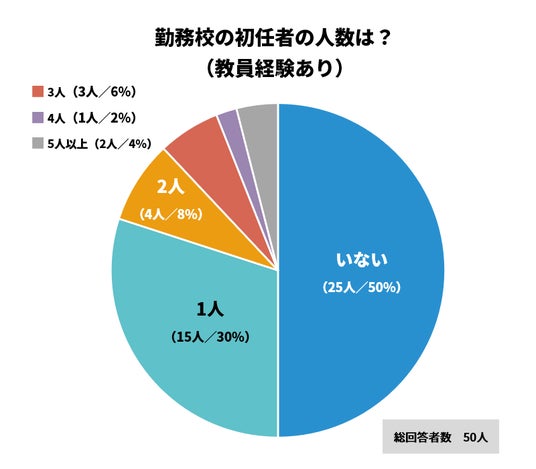 教員経験のある初任者については、25校(50%)で「0人」との回答でしたが、残りの50%の学校では経験のある初任者が配置されています。1人配置が15校(30%)と最も多く、2人配置が4校(8%)、3人配置が3校(6%)、4人配置が1校(2%)、5人以上配置が2校(4%)となっています。