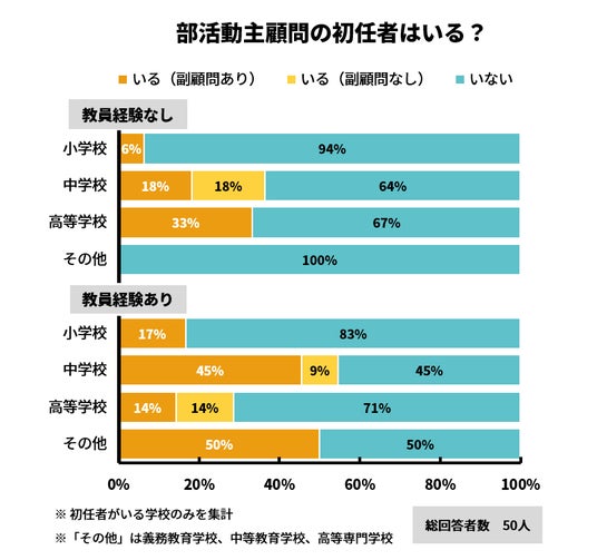 教員経験のない初任者では、「副顧問ありで主顧問を担当」している場合が一定数見られました。小学校・高等学校では見られなかったものの、中学校では「副顧問なしで主顧問を担当」のケースもあり、初年度から重い責任を負っている現状が伺えます。
