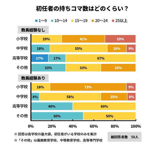 教員経験のある初任者については「20~24コマ」「25コマ以上」の回答が多いですが、校種別の平均は小学校が22.0コマ、中学校が18.2コマ、高等学校が15.6コマ程度と、経験のない初任者と比べても大きな差はありませんでした。