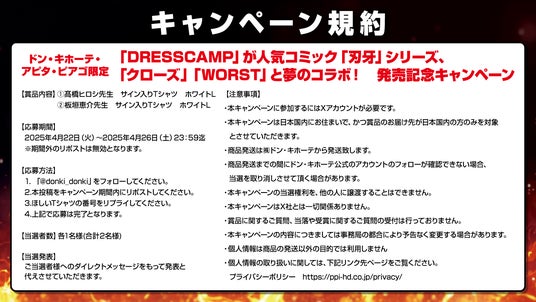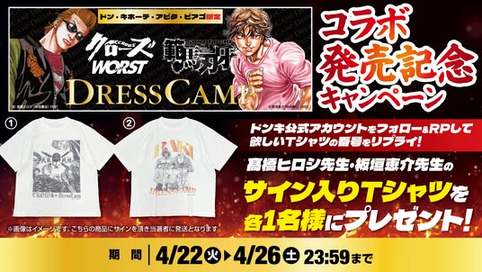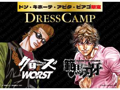株式会社SHIFFON(本社:東京都港区、代表取締役:西村 健太、以下「SHIFFON」)が展開するファッションブランド「DRESSCAMP」は、人気コミック「刃牙」シリーズ、「クローズ」「WORST」とのコラボレーションアイテム全6型を4月末よりドン・キホーテ・アピタ・ピアゴ店舗(一部店舗を除く)にて順次販売いたします。*店舗により入荷状況が異なる場合があります。