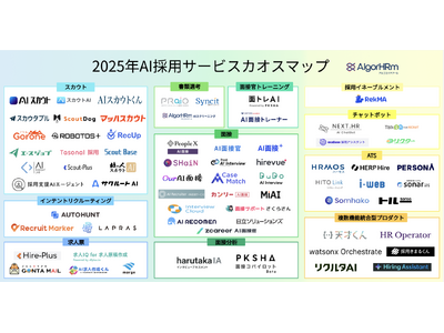 スタートアップ企業向け中途採用支援サービス「Recboo」やHR領域に特化したAIソリューション「AlgorHRm(アルゴエイチアール)」を提供する株式会社ノックラーン(本社:東京都大田区、代表取締役:福本 英、以下ノックラーン)は、AIを活用した最新の採用支援サービスを分類・整理した「2025年AI採用サービスカオスマップ」を公開しました。