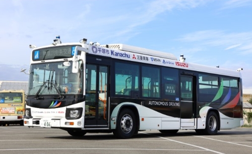 実証実験で使用する自動運転仕様の大型路線バスいすゞ自動車株式会社製「エルガ」