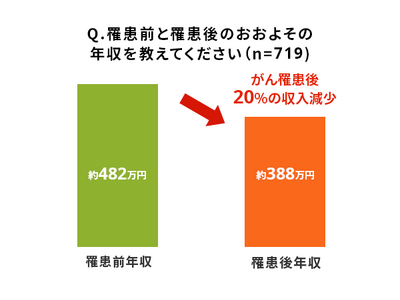 ・がん罹患により、「自身の収入が減った」と回答した人は半数以上。がん罹患後の年収は「平均で20%収入が減少」という結果に。(2017年:20%、2020年:22%)【継続調査】