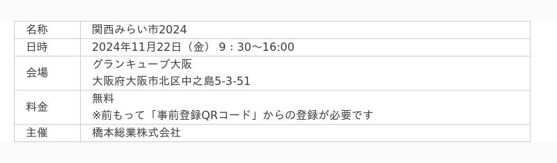 橋本総業株式会社(本社:東京都、代表取締役 阪田貞一 以下橋本総業)は、管工機材および住宅設備機器の大規模な総合展示会「関西みらい市2024」を、大阪府大阪市のグランキューブ大阪にて本年11月22日(金)に開催します。今回の「関西みらい市」は、すでに全国5ヶ所で開催した「みらい市」の第6弾となります。