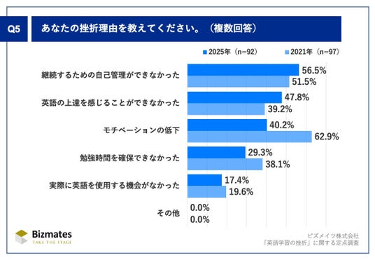 Q3で「何度もある」「1、2回ある」と回答した方に対し、「Q6.Q5で回答した以外に、挫折理由があれば自由に教えてください。(自由回答)」(n=92)と尋ねたところ、「教科書で学んでも会話に活かせなかった」といった、英語を実際に使う場面を意識した声や、「翻訳機能などAIの発展により、語学学習の必要性自体に疑問を感じた」といった時代背景を反映した意見も見られました。また、「時間が取れない」「一度中断すると再開が難しい」といった声は2021年と2025年の両年に共通しており、学習習慣の維持が今なお英語学習における根強い課題であることが伺えます。