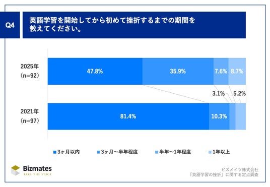 Q3で「何度もある」「1、2回ある」と回答した方を対象に、「Q4.英語学習を開始してから初めて挫折するまでの期間を教えてください。」(n=92)と尋ねたところ、