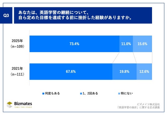 ビジネス特化型オンライン英会話サービス「Bizmates(ビズメイツ)」を提供するビズメイツ株式会社(本社:東京都千代田区、代表取締役社長:鈴木 伸明 、以下「当社」と言う。)は、社会人になってから英語を学習した経験がある会社員109名を対象に 「英語学習の挫折」に関する定点調査(2021年実施の同調査と比較 ※1)を実施しました。