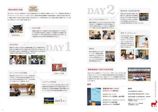 このプログラムでは、期間中、起業家5名、南都キャピタルパートナーズ株式会社、CMVのメンバーに加え、プログラム主催者の株式会社南都銀行、奈良県庁職員など、総勢18名が奈良県に集まり、1泊2日の合宿を行いました。法隆寺見学や信貴山朝護孫子寺宿坊といった、やまと地域ならではの歴史・文化を体感し、非日常空間で集中的にロジックモデルの作成・ブラッシュアップに取り組みました。